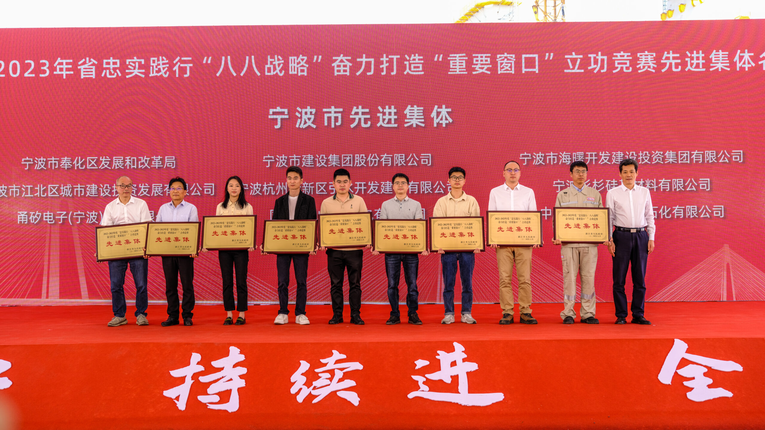 ? ? ? ?會(huì)上,為全市9家獲得浙江省忠實(shí)踐行“八八戰(zhàn)略”、奮力打造“重要窗口”立功競(jìng)賽先進(jìn)集體的單位授牌,我公司是唯一獲此殊榮的施工單位。